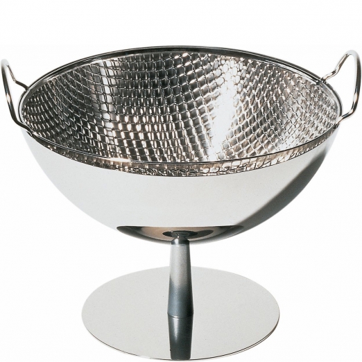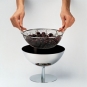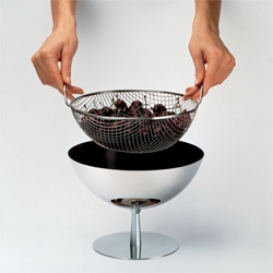 Hinter einem schlichten, sachlichen Stil verbirgt sich Castiglionis Bestreben, "immer neue Dinge auszuprobieren, sich nie mit der schnellen offensichtlichen Lösung zufrieden zu geben", (Konstantin Grcic). Der Erfolg gibt dem Designer Recht. Die Etagere mit Sieb schimmert mit auf Hochglanz poliertem Metall in einem Durchmesser von 24.9 cm und zeigt sich als 20,5 cm hohes, clever durchdachtes Kunstwerk, das gerade wegen seines reduzierten Designs farbenfrohe Früchte edel und elegant prÀsentiert.