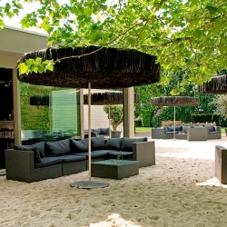 Ob am liebevoll gestalteten, privaten Swimming Pool oder an der luxuriösen Poolanlage exklusiver Hotels, der Sonnenschirm Frou Frou wirft mit seiner leichtgÀngigen, gastronomieerprobten Spannvorrichtung und dem Schirmgestell mit zwölf Aluminiumstreben mit einem Durchmesser von 2,50 m und mit einer Höhe von 2,49 m mühelos lange Schatten. Der schimmernde Schirmmast glÀnzt in gebürstetem Edelstahl mit einem Durchmesser von 40 mm und die lebendigen, flüsternden Raphiabast-Streifen tanzen im eleganten, schwarzen, strahlend weißen oder frischen, grünen Kleid.