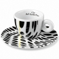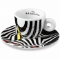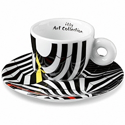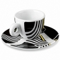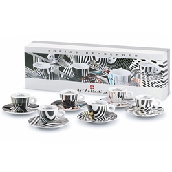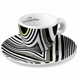 Die optischen und geometrischen Motive, die Tobias Rehberger auch für die Gestaltung der Cafeteria des Palazzo delle Esposizioni in den Giardini der Kunstbiennale in Venedig benutzt hat, spiegeln sich auf feinstem Porzellan wieder und ein unverkennbarer Camouflage-Effekt wird kreiert. Die visuelle Wahrnehmung des Betrachters unterliegt einer Illusion. Diese Technik ist wesentliche Grundlage für Rehbergers künstlerische Inspiration für illy.